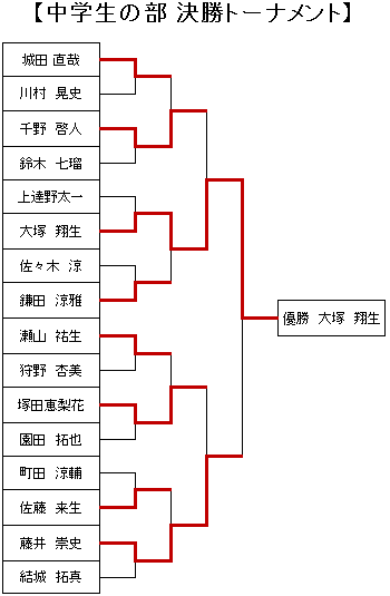 2014年1月3日にLABI1高崎で行われた、 第7回YAMADAこども将棋大会は、 以下の通り入賞者が決まりました。 【中学生の部】 優勝 :大塚翔生 準優勝:藤井崇史 三位 :千野啓人・塚田恵梨花 決勝トーナメント 【小学生高学年の部】 優勝 :岩松達哉 準優勝:山城正樹 三位 :宮武知也・鈴木廉太郎 決勝トーナメント 【小学生低学年の部】 優勝 :小窪碧 準優勝:上田琥珀 三位 :桑原志隆・堀内健世 決勝トーナメント 【初心者の部】 優勝 :吉岡幸輝 準優勝:角野豊 三位 :松本純輝・成澤颯真 決勝トーナメント 当日の模様は日本将棋連盟HPへ |